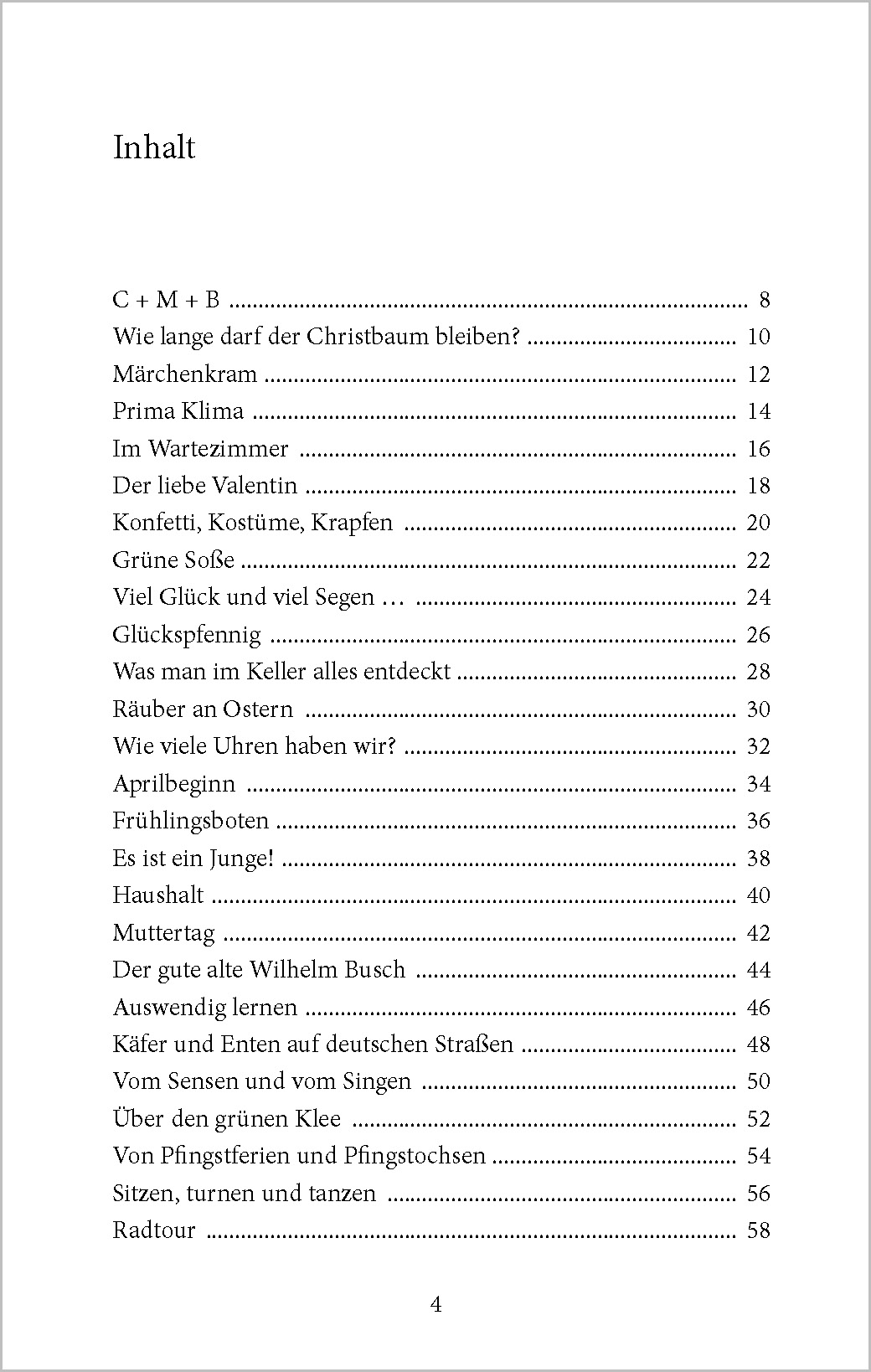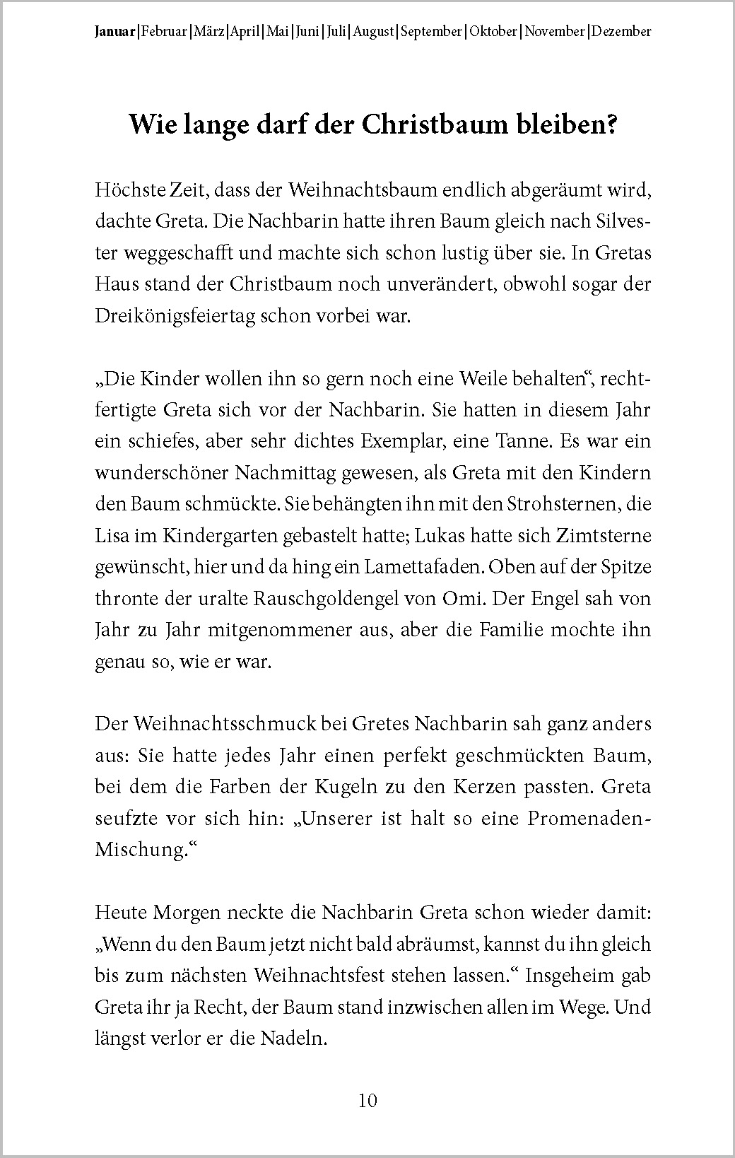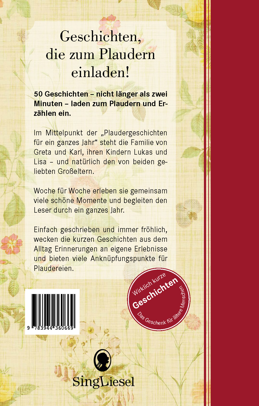 50 Geschichten - nicht länger als zwei Minuten - laden zum Plaudern und Erzählen ein. Im Mittelpunkt steht eine kleine sympathische Familie, die gemeinsam die verschiedenen Ereignisse und Feste im Jahresverlauf erlebt. Einfach geschrieben und immer fröhlich, bieten unsere Kurzgeschichten aus dem Alltag viele Anknüpfungspunkte für Plaudereien. Bewusst kurz gehalten, geht die Aufmerksamkeit während des Lesens und Zuhörens dieser Geschichten nicht verloren. Die Geschichten eignen sich so ganz einfach für kurze Lese-Ausflüge "zwischendurch" und sind ideal für Senioren - auch mit Demenz.