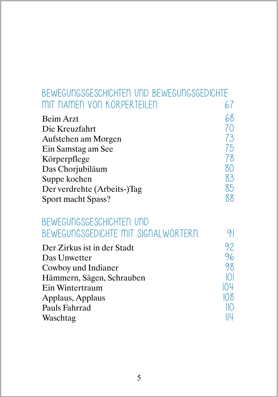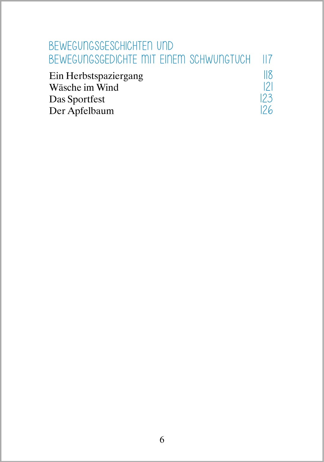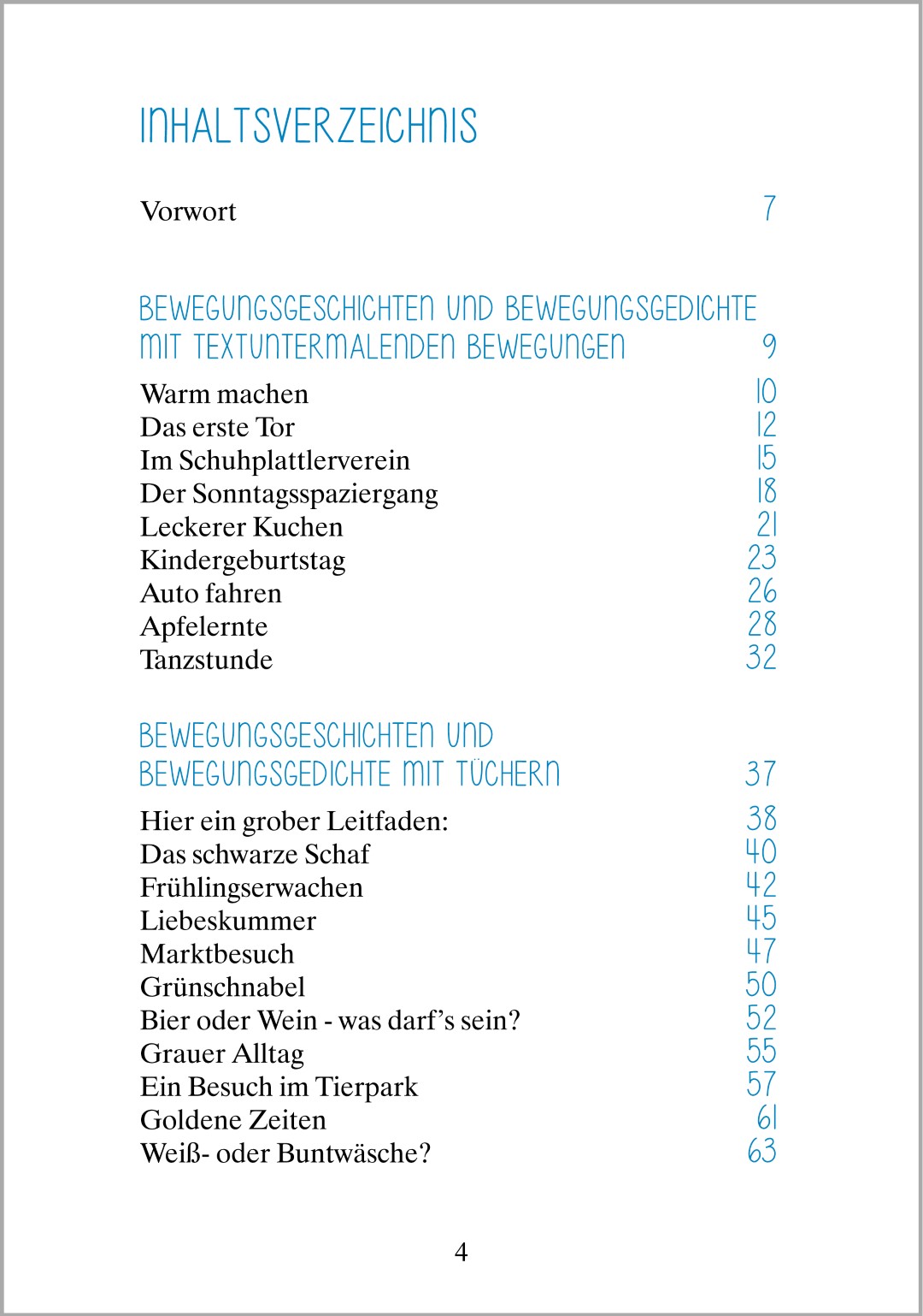 Die Geschichten und Gedichte enthalten speziell gekennzeichnete Passagen, die zu Bewegungen anregen. Dabei ist jeweils angegeben, ob die Ausführung mit einfachen Bewegungen oder unter Einbeziehung eines Tuchs erfolgt. - Wie viele Geschichten sind enthalten?