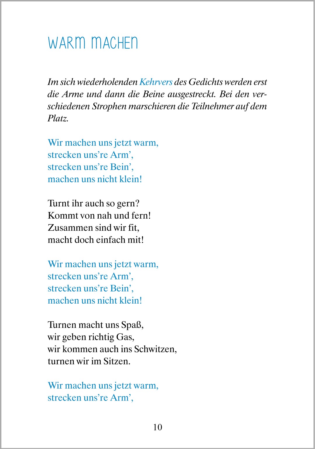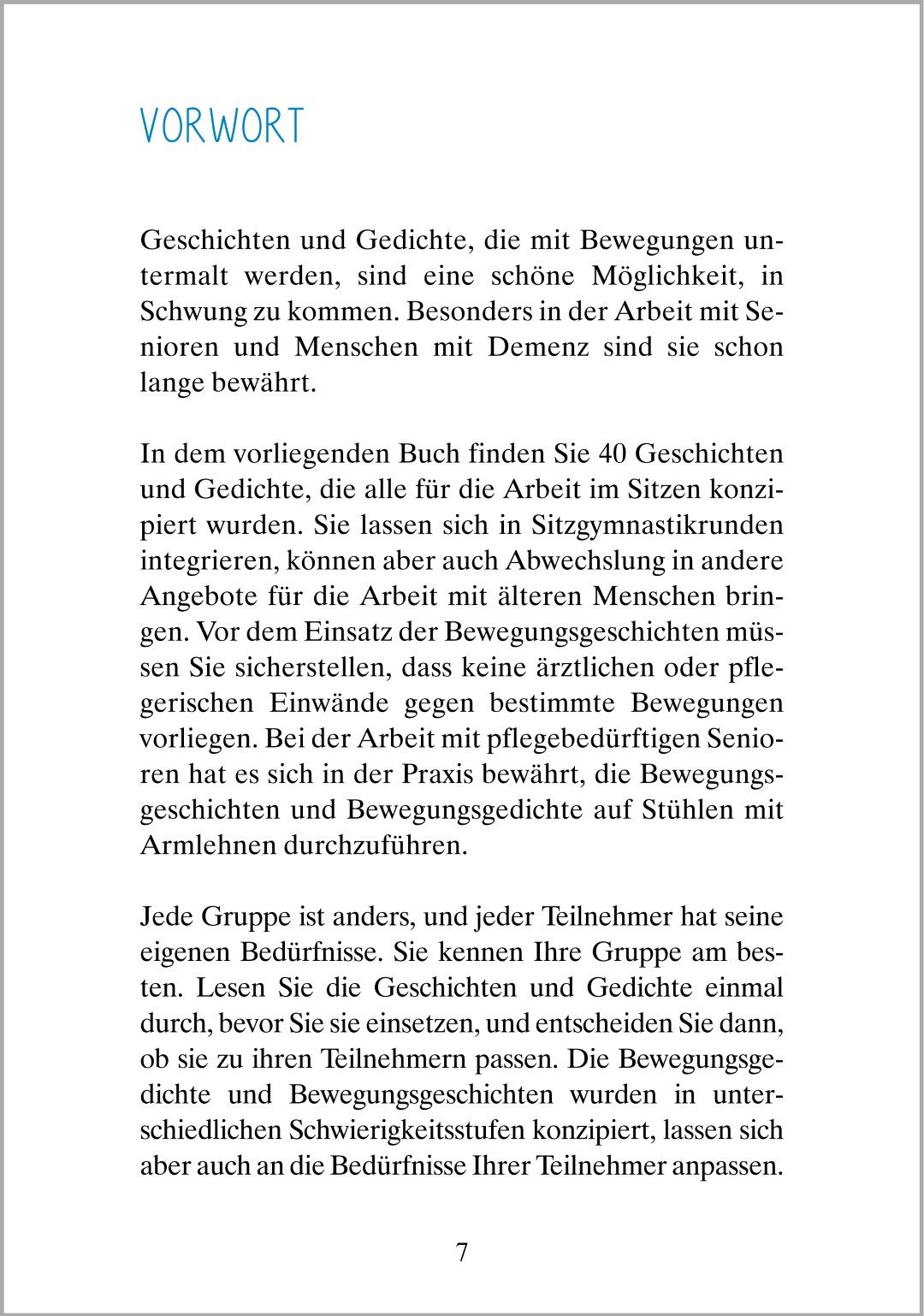 Gerade, wenn vieles vielleicht nicht mehr so geht wie in jungen Jahren, ist Bewegung für Körper und Geist wichtig. In diesem Praxisbuch finden Sie 40 humorvolle und warmherzige Bewegungsgeschichten und Bewegungsgedichte, die alle im Sitzen durchgeführt werden können. Geschichten und Gedichte, die mit Bewegungen untermalt werden, sind eine schöne Möglichkeit, in Schwung zu kommen. Besonders in der Arbeit mit Senioren und Menschen mit Demenz sind sie schon lange bewährt. Wir wünschen Ihnen viel Spaß mit unseren Gedichten und Geschichten!