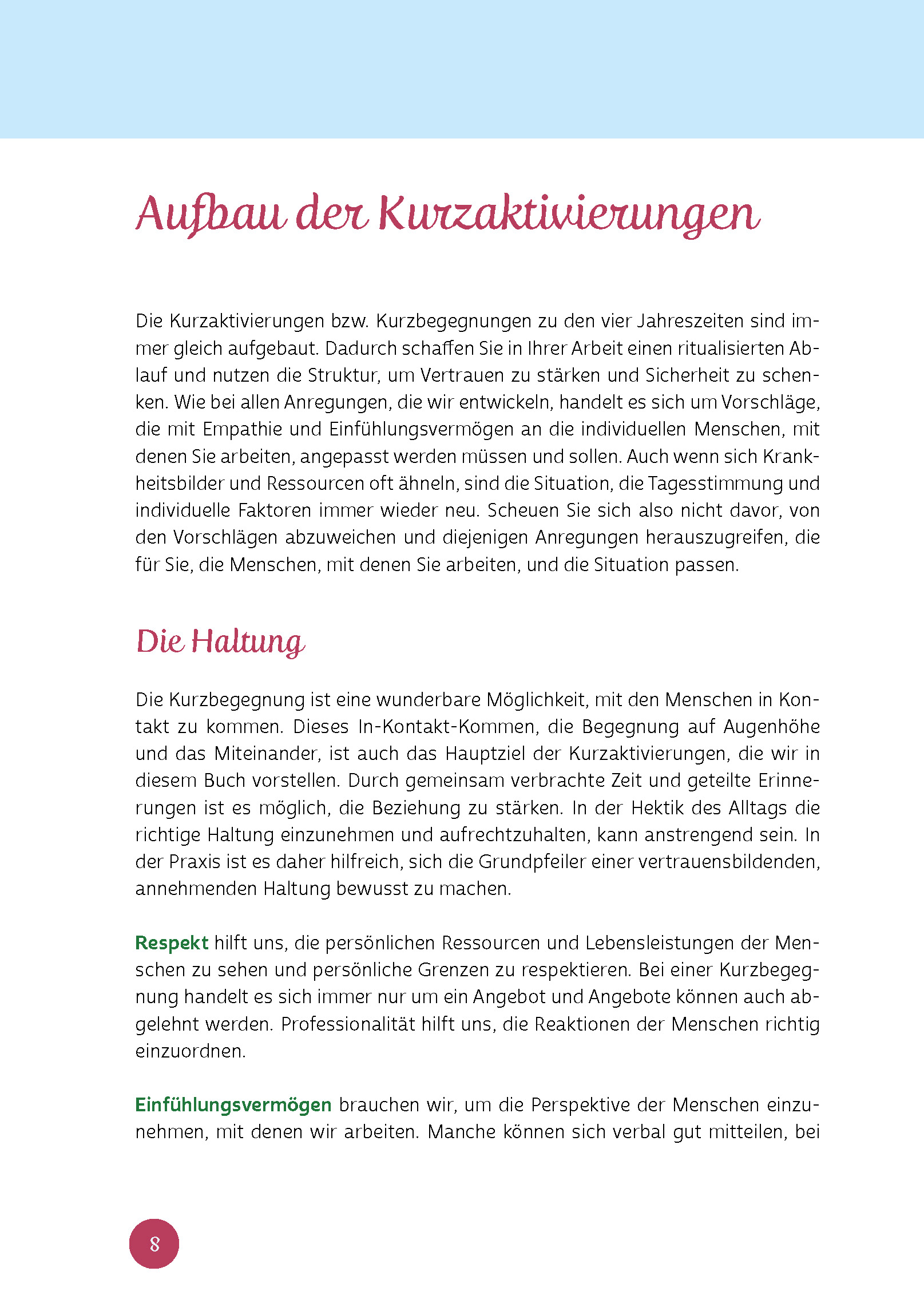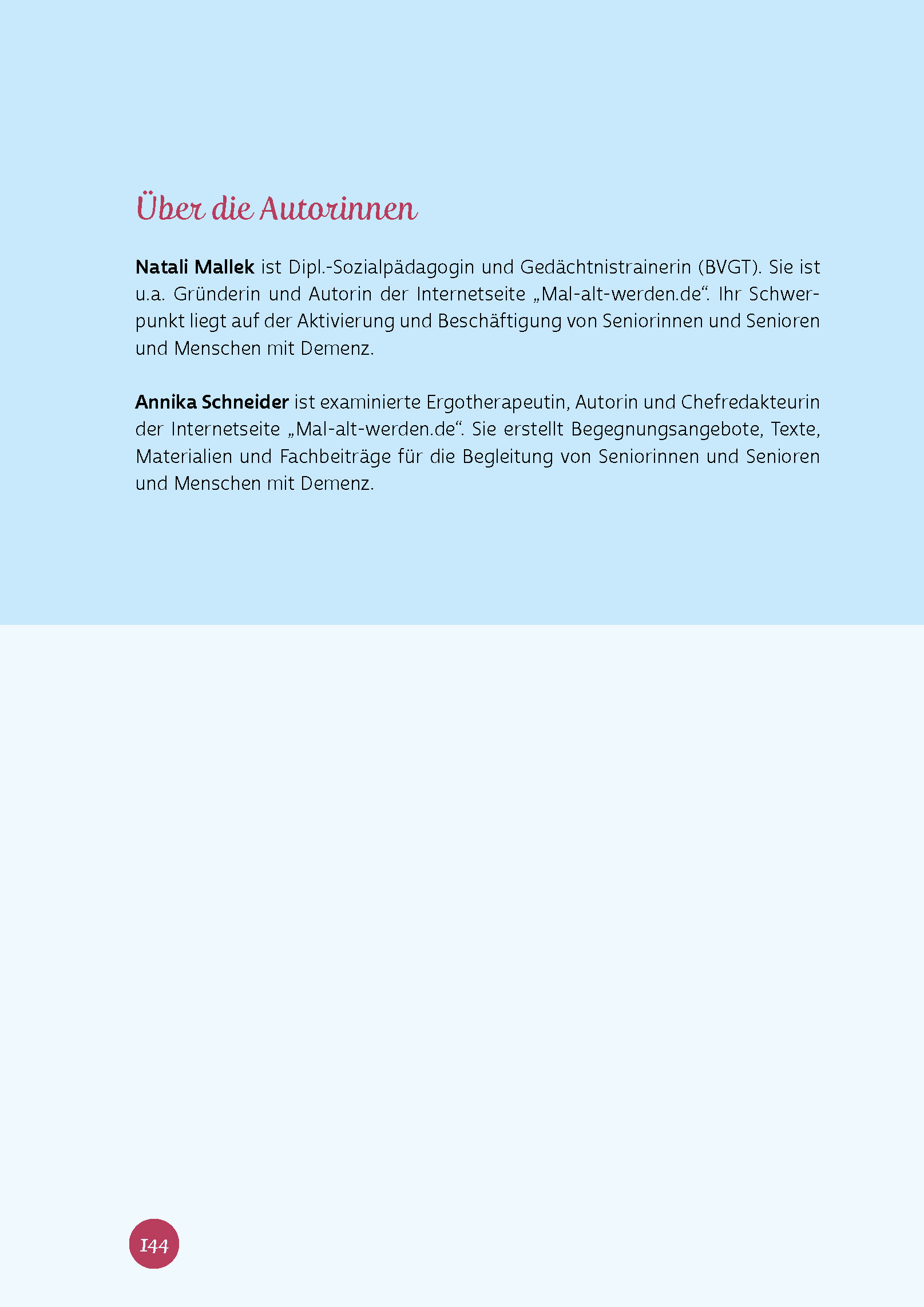 Mit Herz und Professionalität verfassen und erstellen sie Fachbeiträge, Begegnungsangebote, Text und Materialien für die Aktivierung und Beschäftigung von Seniorinnen und Senioren und Menschen mit Demenz.