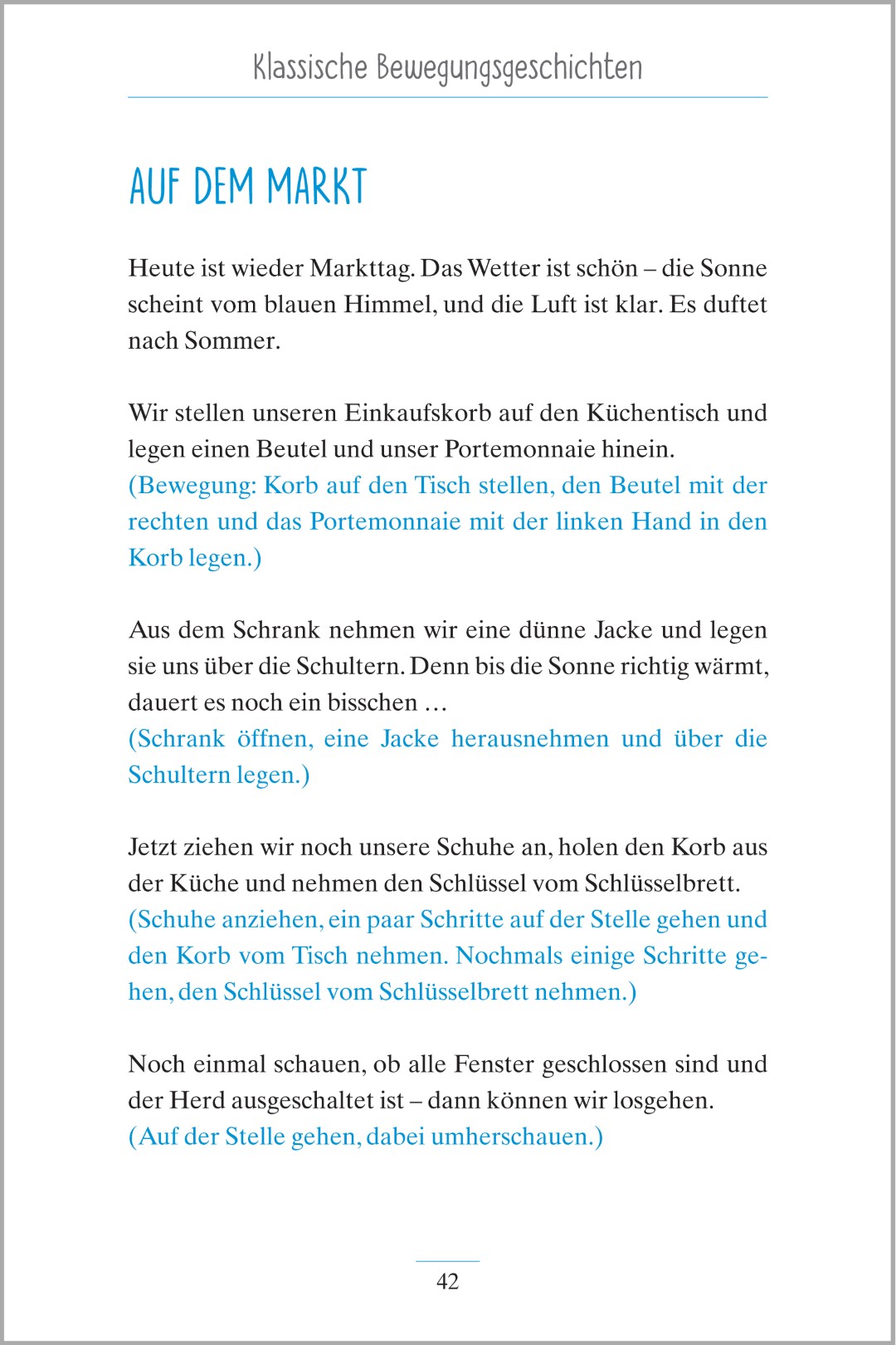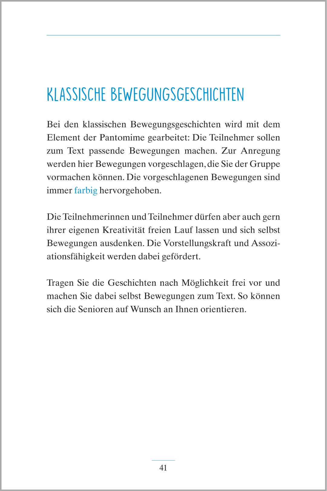 Das Buch vereint Bewegung mit Erzählfreude und ist daher eine Form der Aktivierung, die Körper und Geist gleichermaßen anspricht. Die kurzen Einheiten fördern die soziale Teilhabe, bringen Abwechslung in die Betreuung und lassen sich flexibel in den Alltag integrieren.