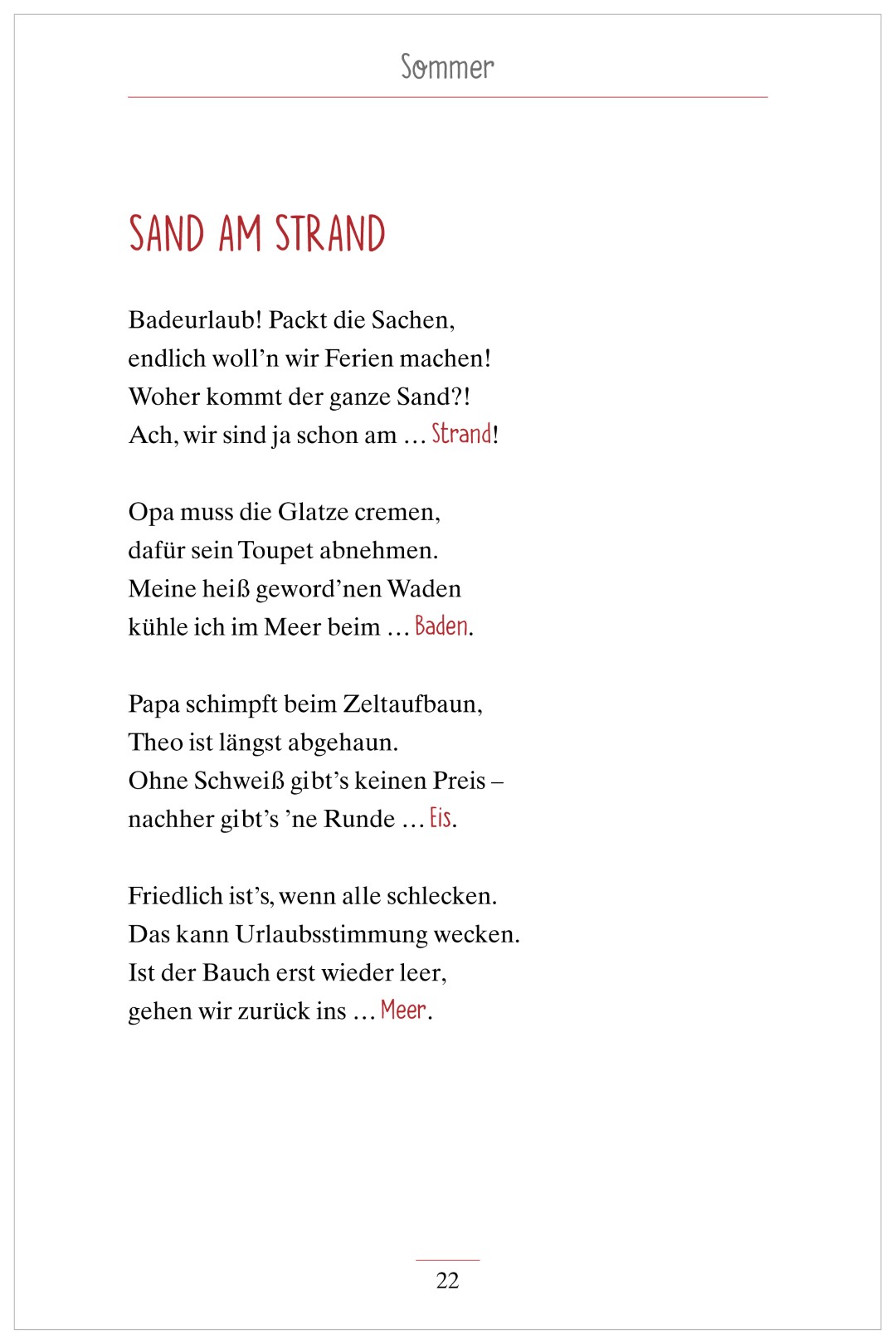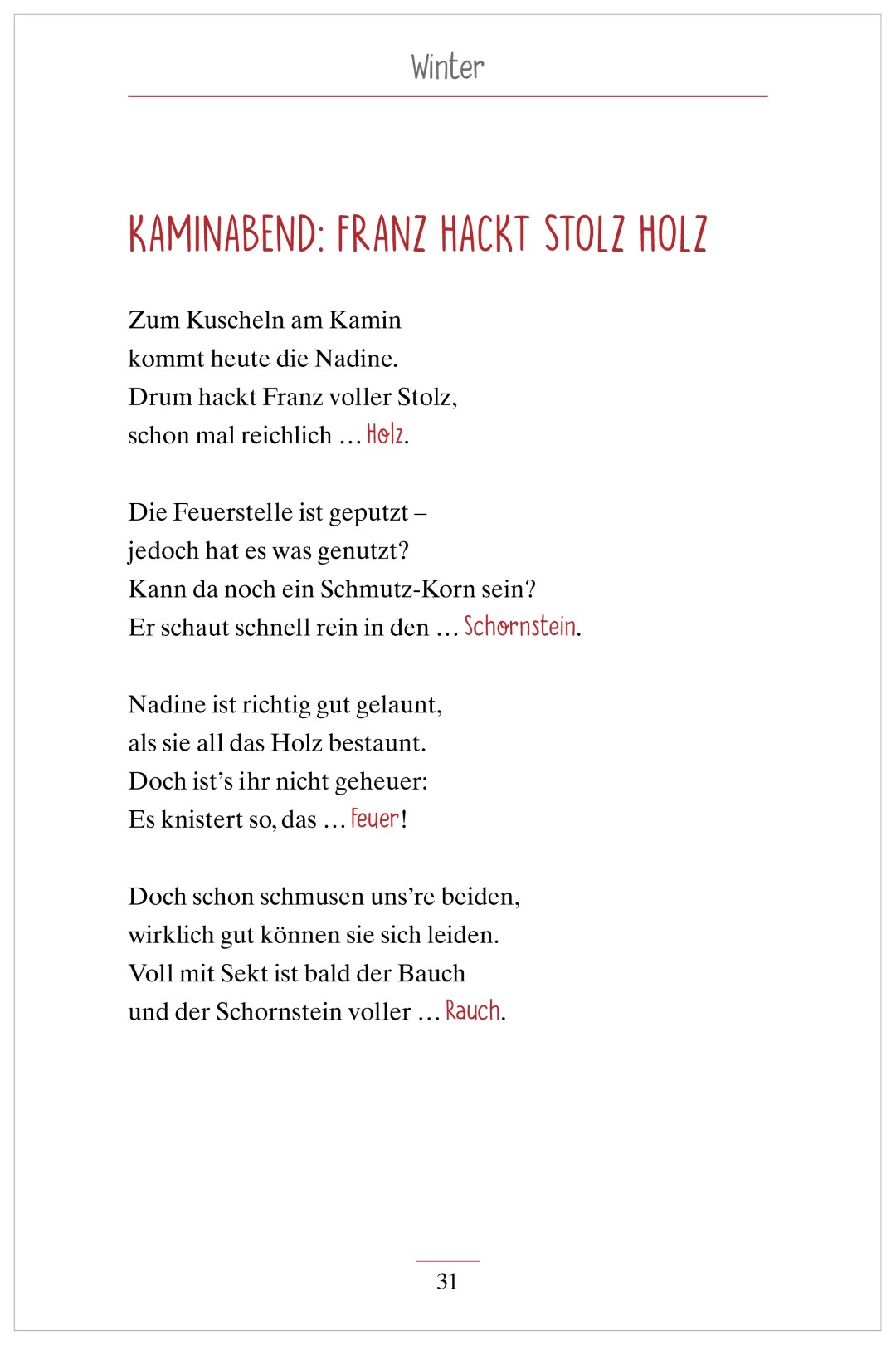 Am Ende jeder Strophe fehlt ein Reimwort. Um es zu finden, können Reimgefühl und das passende Thema als Hilfe dienen – alle Lösungen passen thematisch zusammen und lassen sich auch durch Assoziation herausfinden.