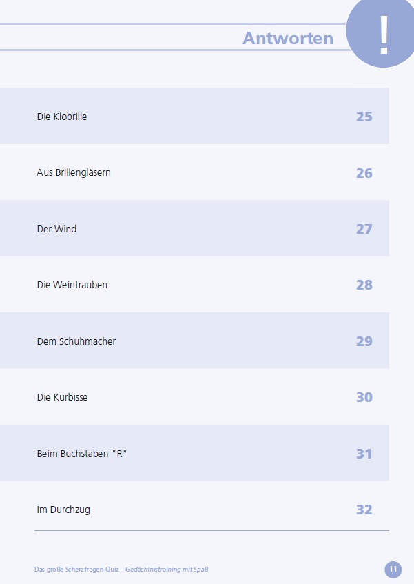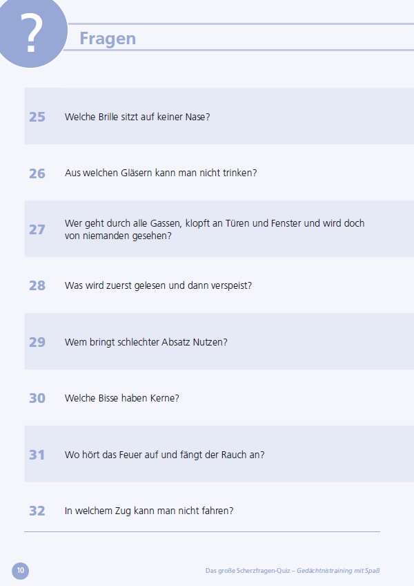 Warum sind Rätsel so gefährlich? Weil man sich daran den Kopfzerbrechen kann... Gleichzeitig machen Scherzfragen jede Menge Spaß und sind eine tolle Idee für ein lockeres und vergnügliches Gedächtnistraining.