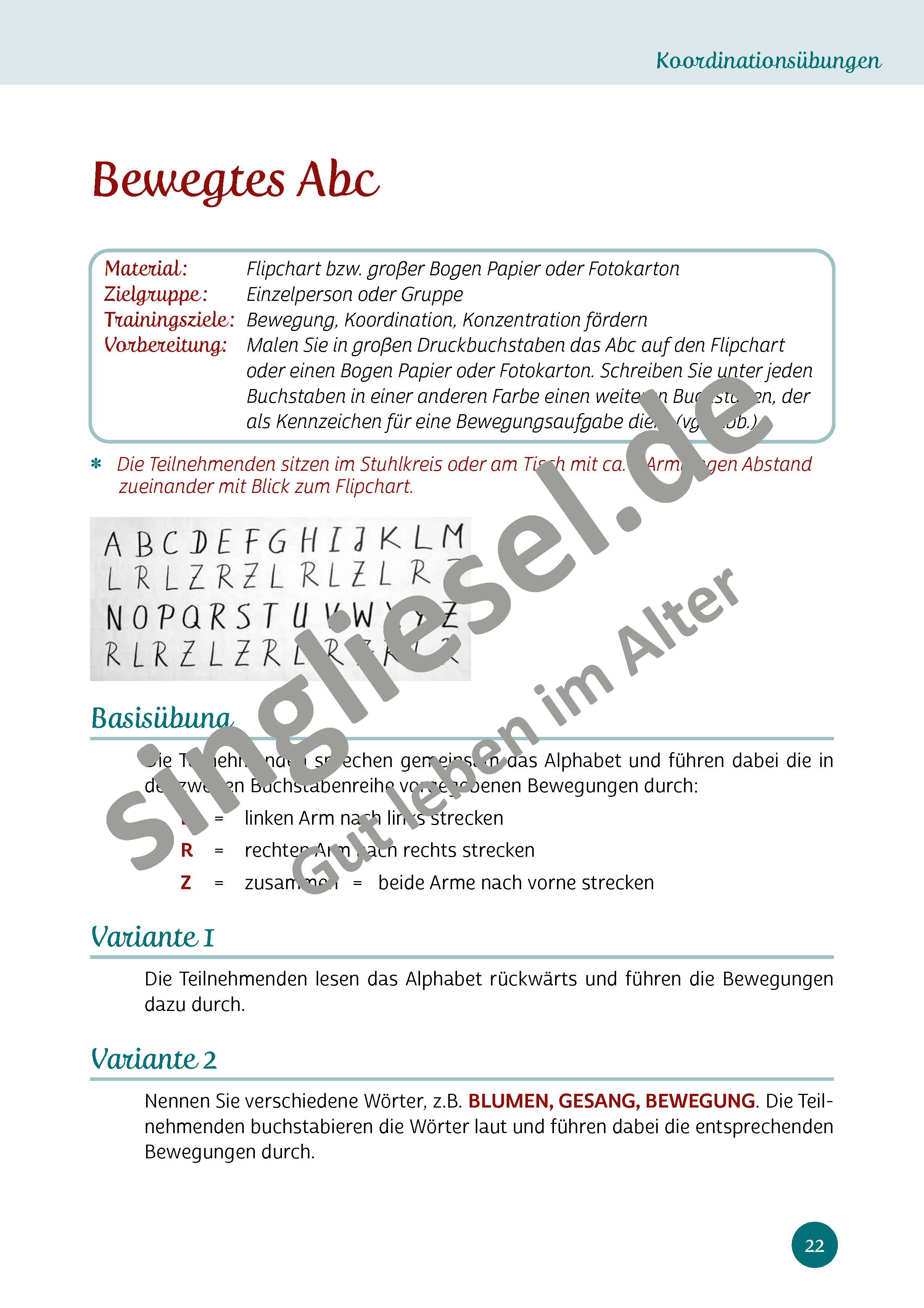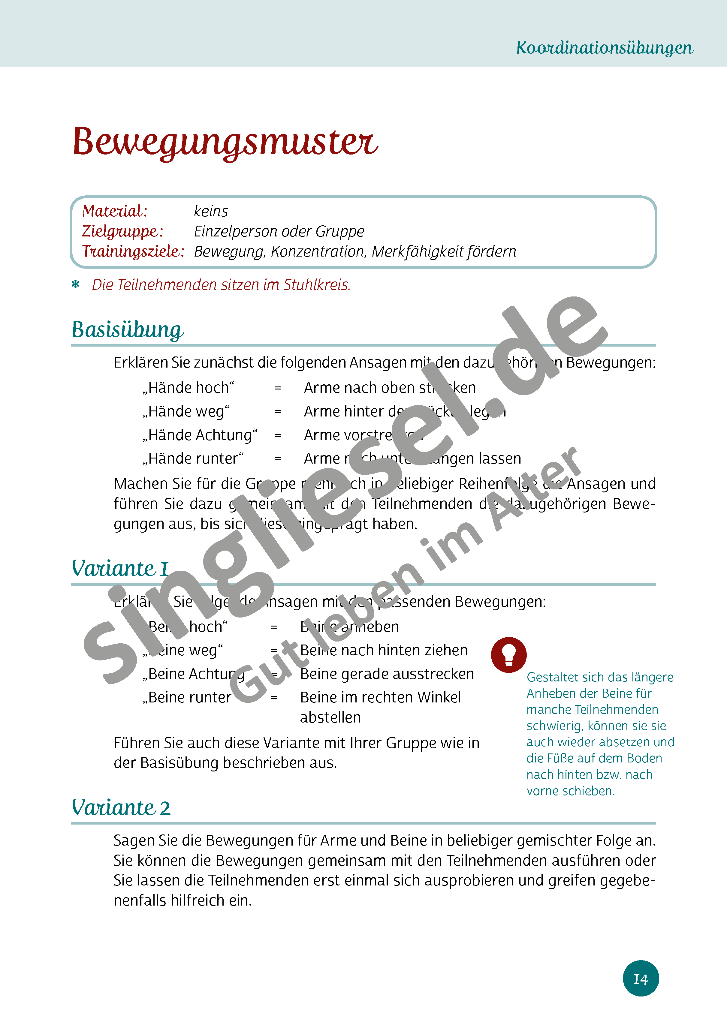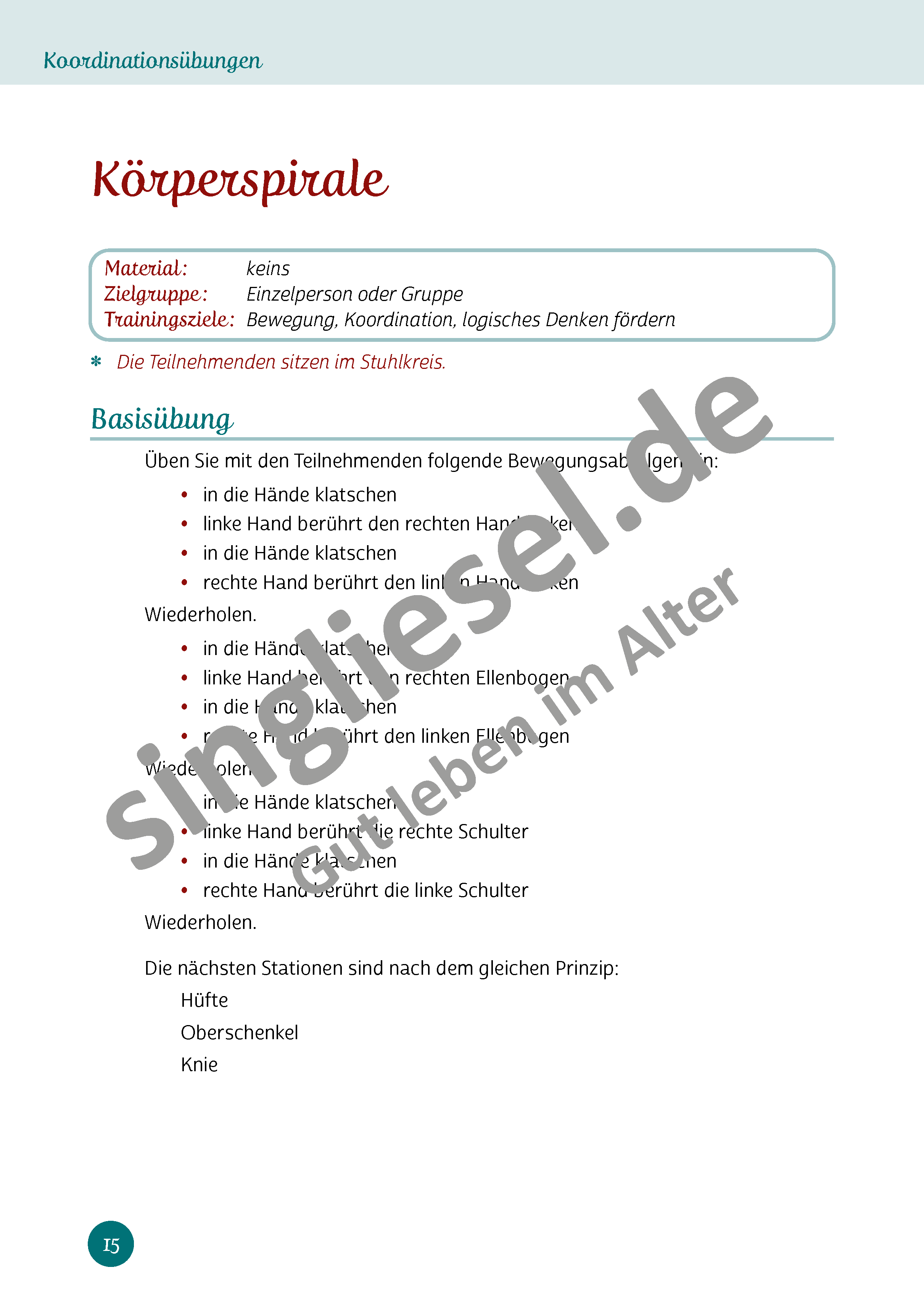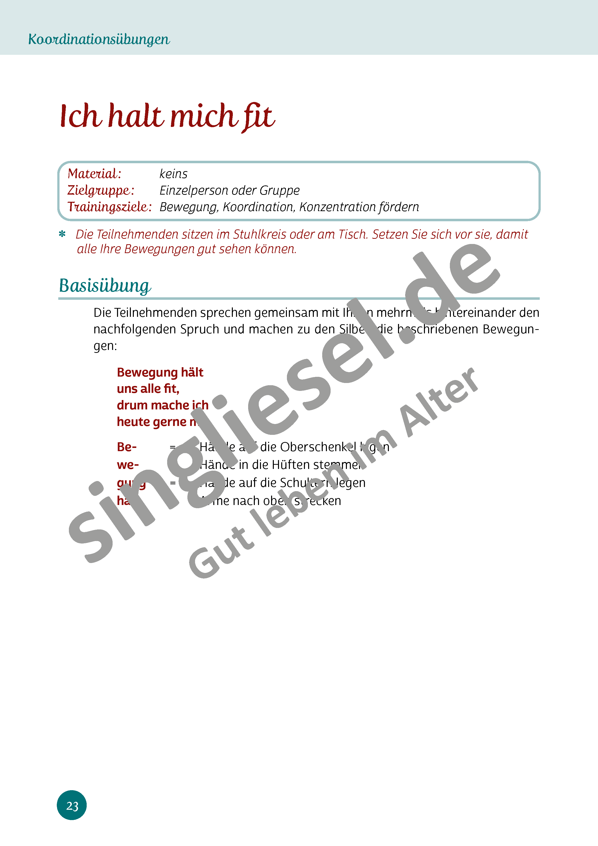 Die Übungssammlung verbindet wertvolles Gedächtnistraining mit kleinen Bewegungsaufgaben. Auf diese Weise werden neben der Konzentration, Wahrnehmung und Merkfähigkeit das Gleichgewicht, die Reaktion und Koordination und vieles mehr gefördert.