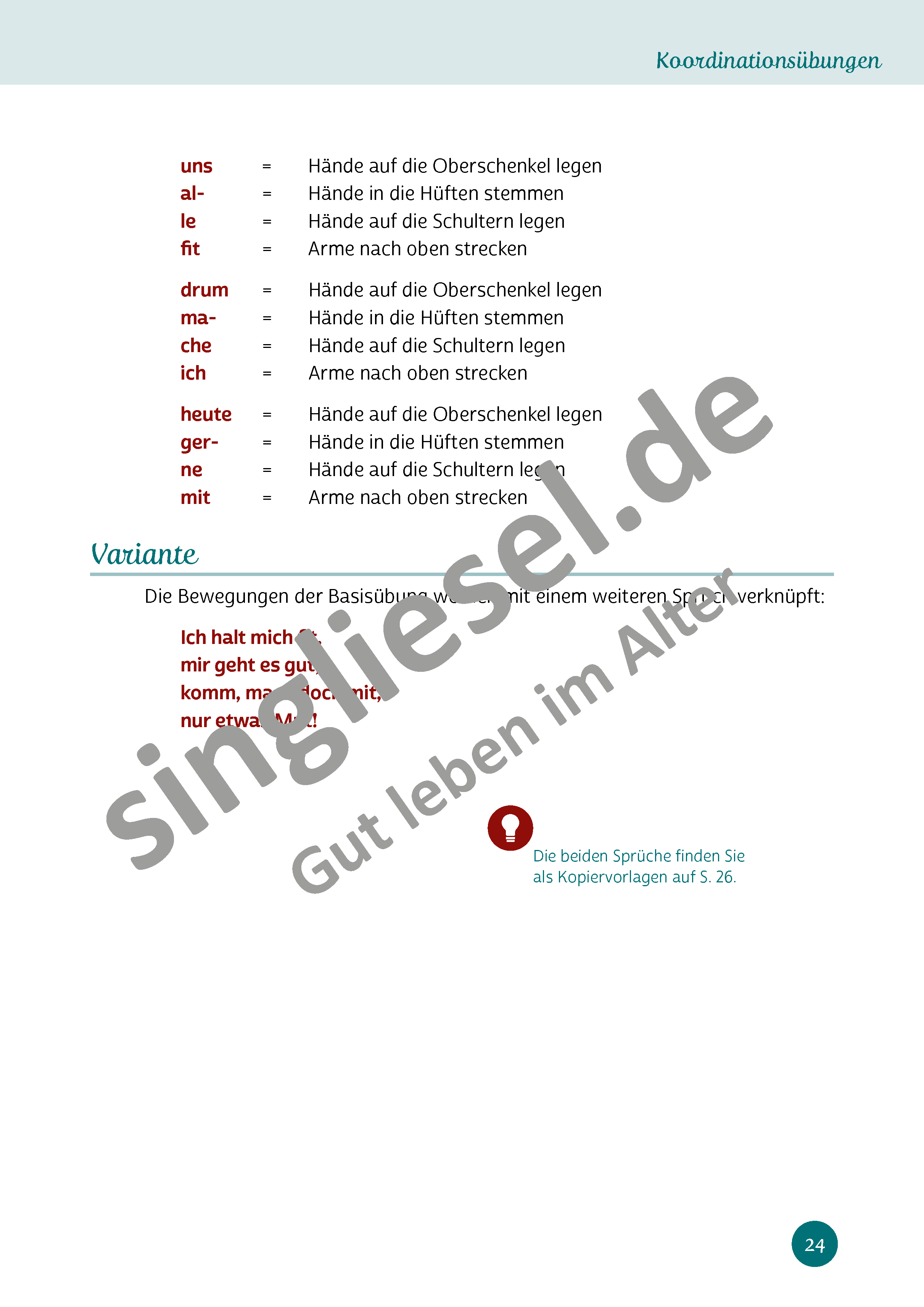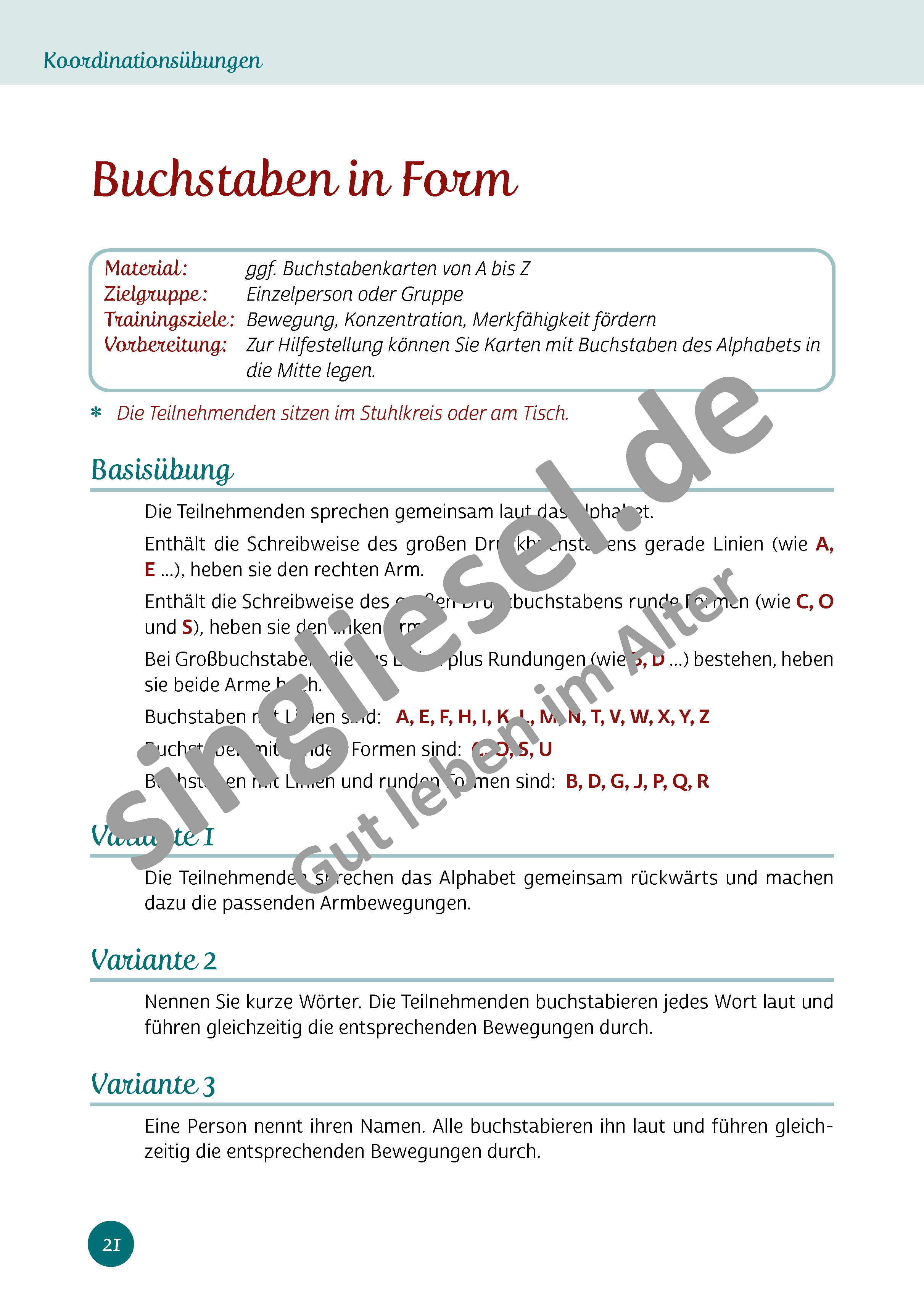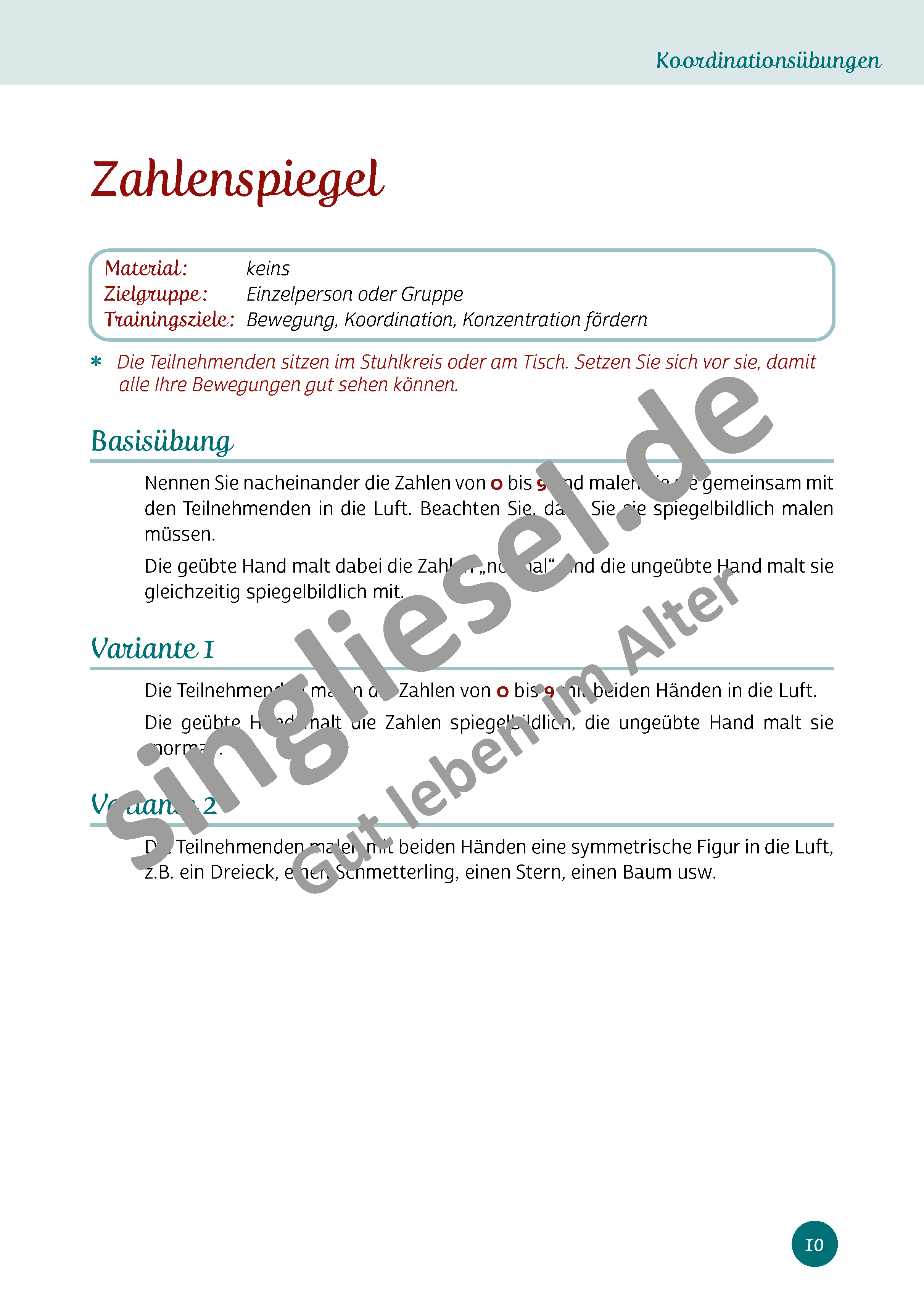Die Übungssammlung verbindet wertvolles Gedächtnistraining mit kleinen Bewegungsaufgaben. Auf diese Weise werden neben der Konzentration, Wahrnehmung und Merkfähigkeit das Gleichgewicht, die Reaktion und Koordination und vieles mehr gefördert.