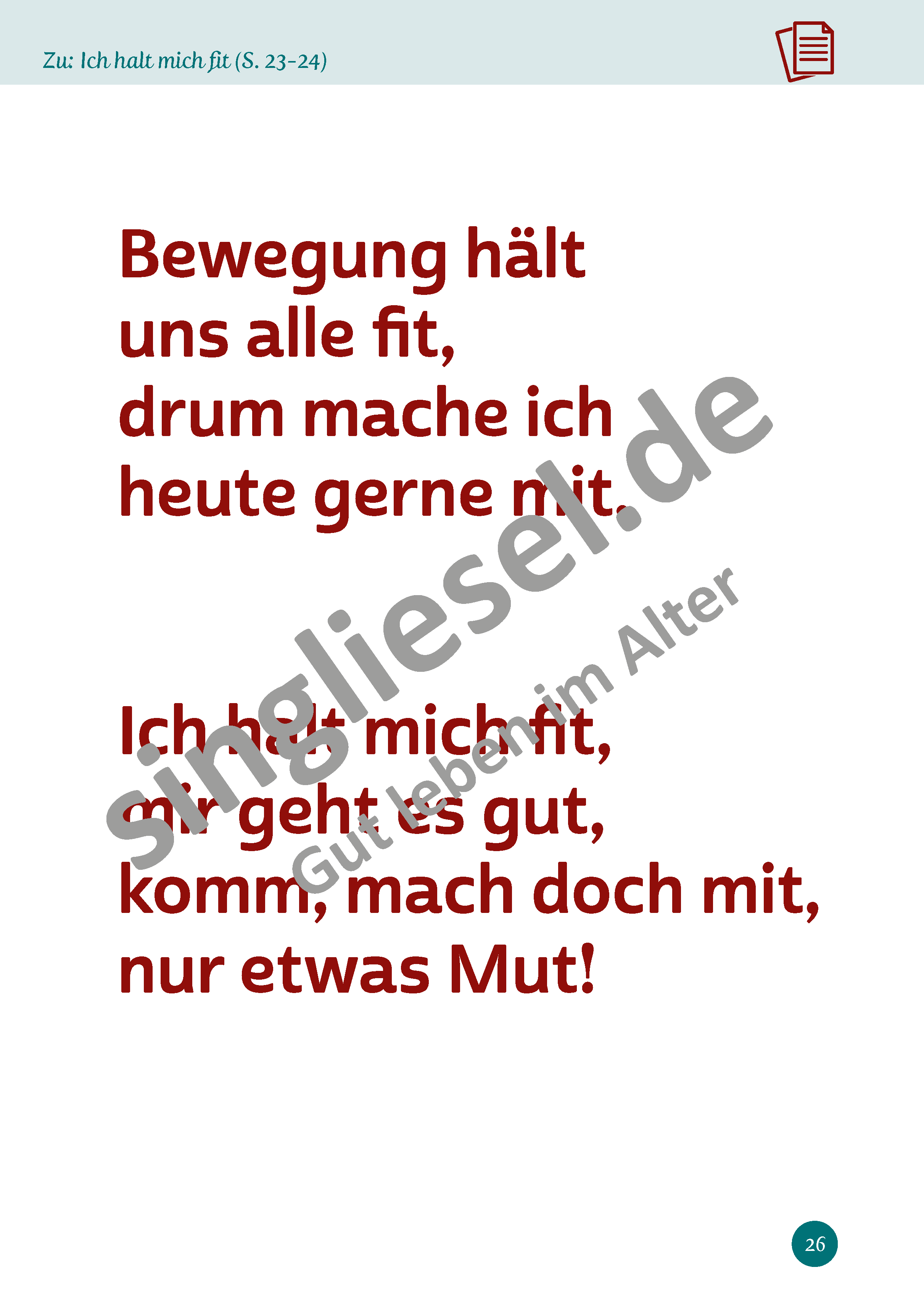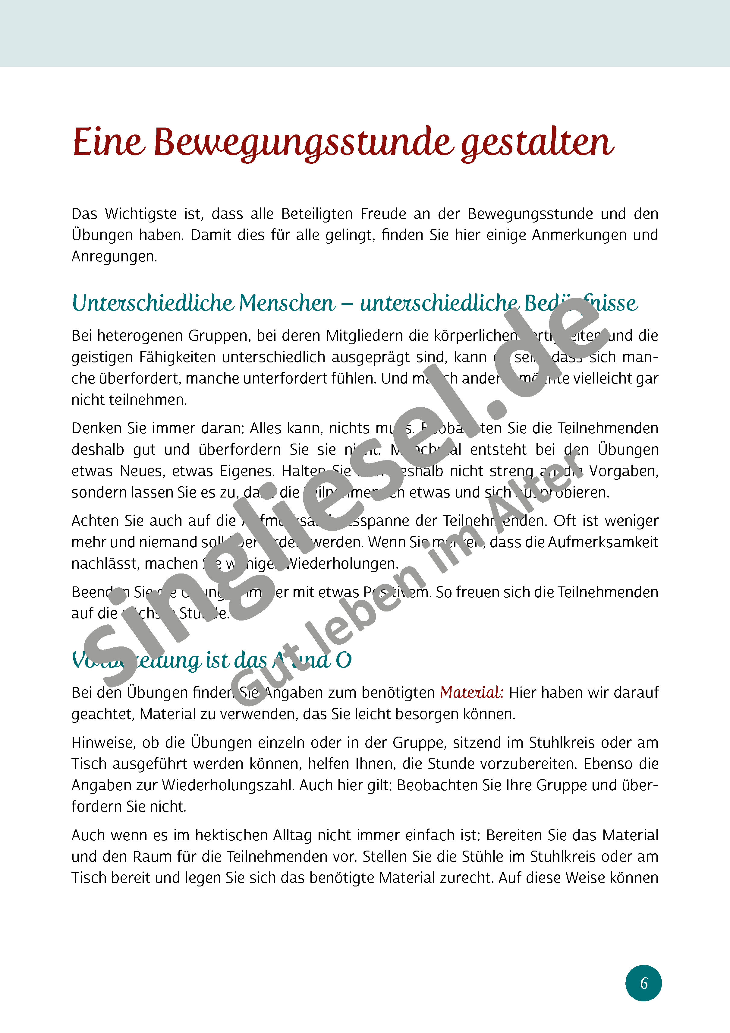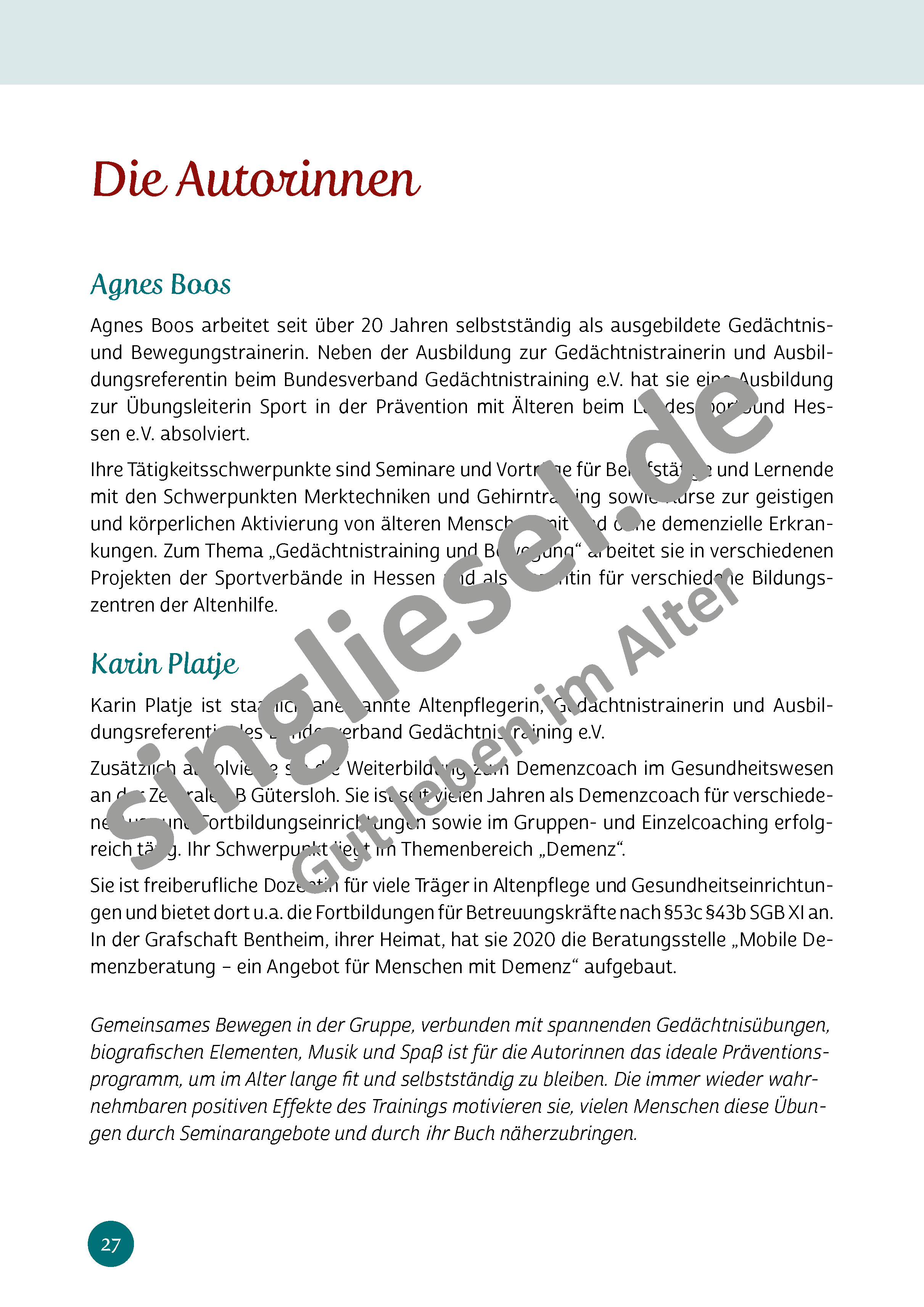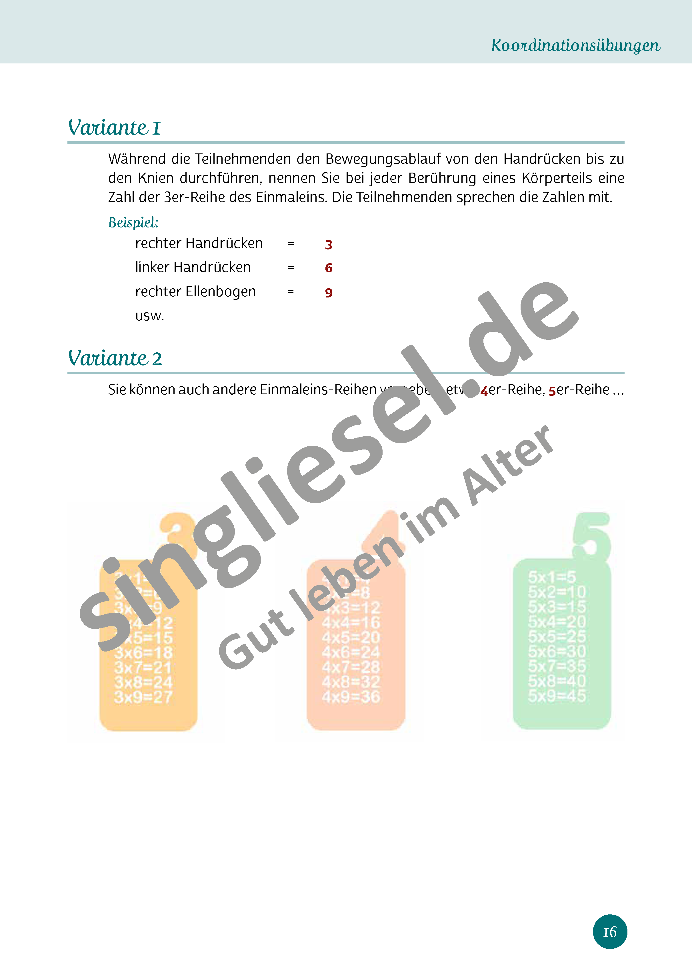Die Übungssammlung verbindet wertvolles Gedächtnistraining mit kleinen Bewegungsaufgaben. Auf diese Weise werden neben der Konzentration, Wahrnehmung und Merkfähigkeit das Gleichgewicht, die Reaktion und Koordination und vieles mehr gefördert.