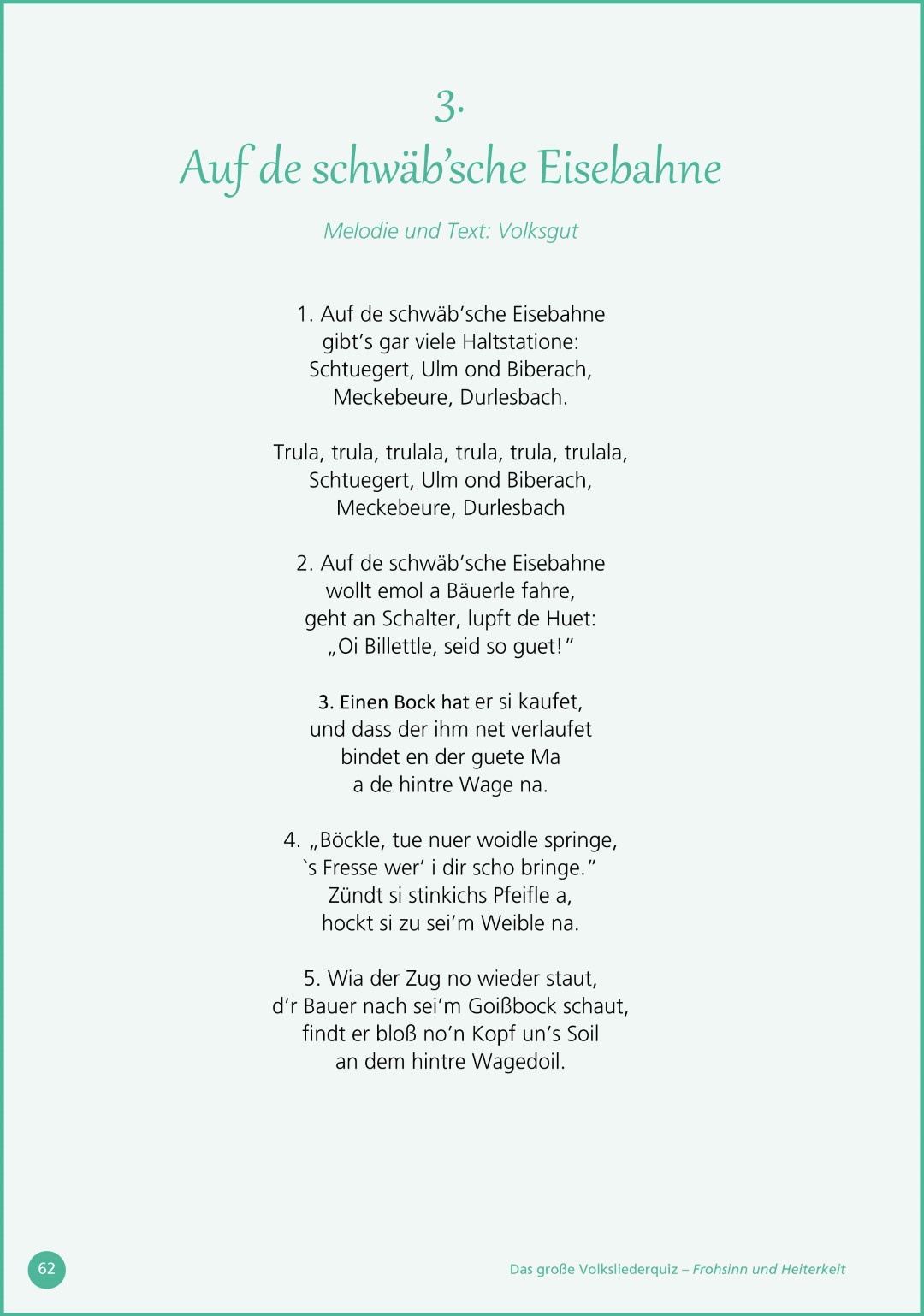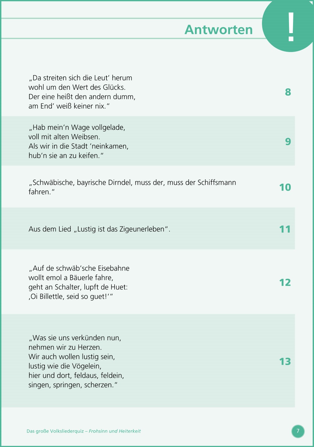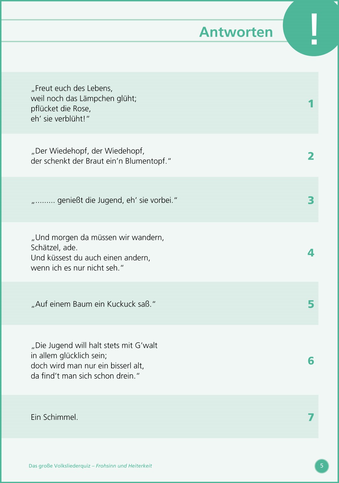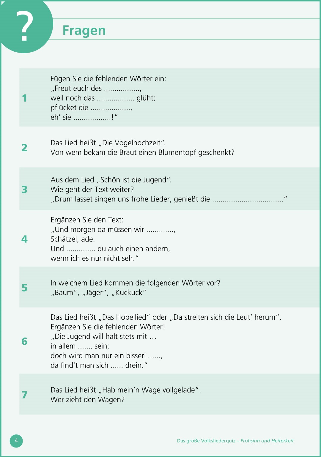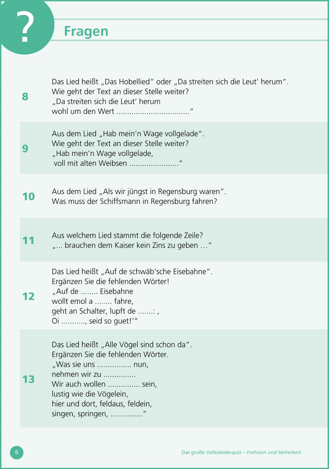 Ja! Die Fragen sind einfach und konkret gestellt. Die Lösung gibt es natürlich dazu, sodass das Quiz leicht in den Alltag integriert werden kann. Ideal für das Gedächtnistraining zwischendurch! - Wie viele Fragen und Liedtexte sind enthalten?
