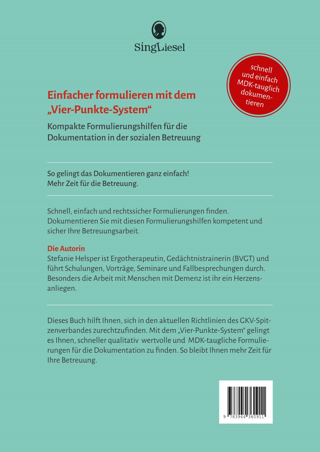 Schnell, einfach und rechtssicher Formulierungen finden. Dokumentieren Sie mit diesen Formulierungshilfen kompetent und sicher Ihre Betreuungsarbeit Dieses Buch hilft Ihnen, sich in den aktuellen Richtlinien des GKV-Spitzenverbandes zurechtzufinden. Mit dem „Vier-Punkte-System“ gelingt es Ihnen, schneller qualitativ wertvolle und MDK-taugliche Formulierungen für die Dokumentation zu finden. So bleibt Ihnen mehr Zeit für Ihre Betreuung. So gelingt das Dokumentieren ganz einfach - für mehr Zeit für die Betreuung!