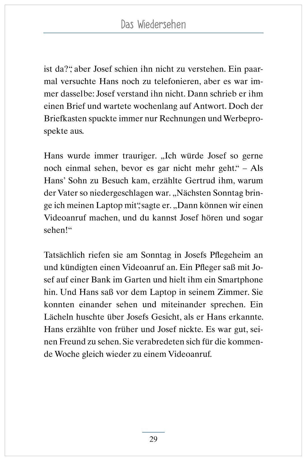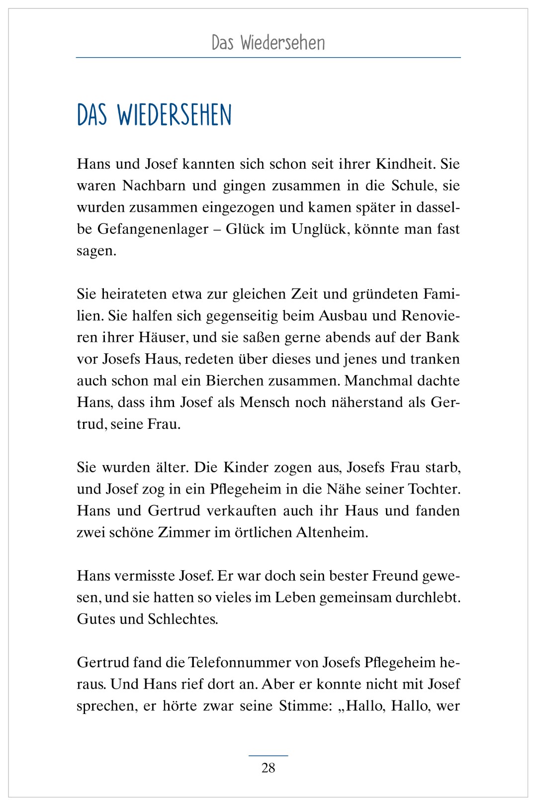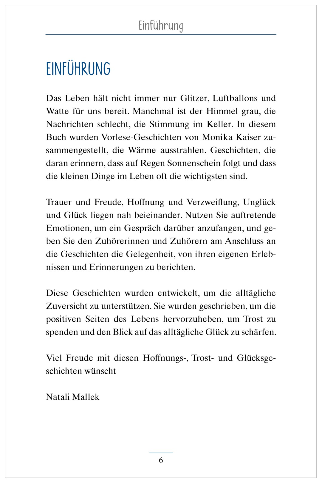 Lebensnahe, kurze Geschichten zu den Themen Trost, Hoffnung und Glück werden im eigenem Tempo vorgelesen. Sie regen zum Nachdenken an und bieten Raum für Gespräche, um gemeinsam Erinnerungen zu teilen und emotionale Momente mit den Senioren zu reflektieren. - Ist das Buch auch ohne Vorwissen nutzbar?