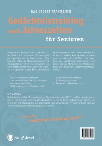 Wenn unsere Sinne gefordert sind, läuft unser Gehirn auf Hochtouren. Es verarbeitet und speichert ständig Informationen. Was liegt also näher, als Gedächtnistraining mit jahreszeitlichen Themen zu verknüpfen? Die Jahreszeiten geben dem Jahr seine Struktur und sprechen unsere Sinne und unsere Wahrnehmung an: Wir riechen, schmecken, fühlen und erleben jede Jahreszeit auf eine ganz besondere Art und Weise. Die Übungen sind verständlich beschrieben und bieten älteren Menschen die Möglichkeit, Spaß und Freude am Gedächtnistraining zu erleben.