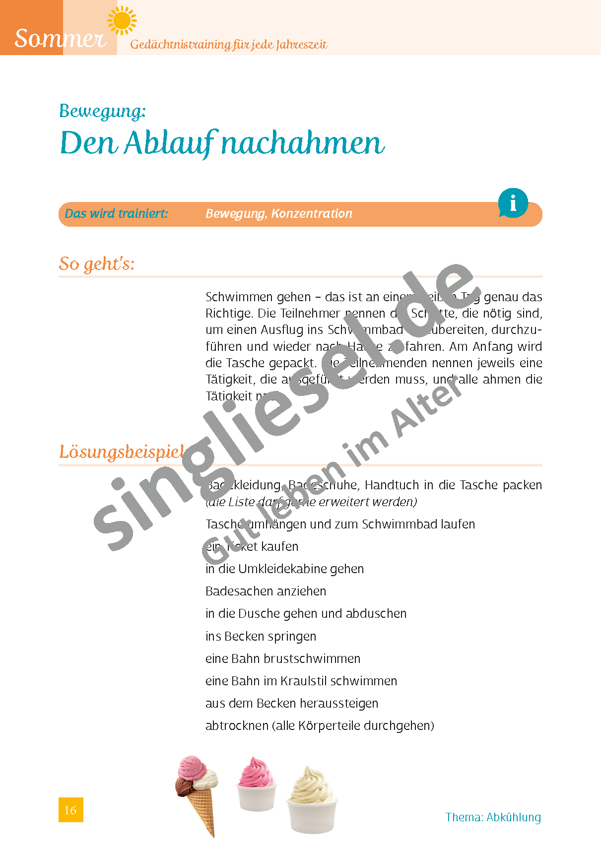 Sommer, Sonne, Eis und Urlaubszeit … Der Sommer bietet viele Anregungen für ein gelungenes Gedächtnistraining. Die Themenstunden lassen sich ohne viel Vorbereitungszeit und Material umsetzen.