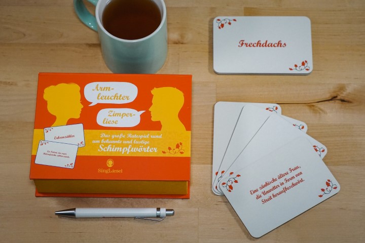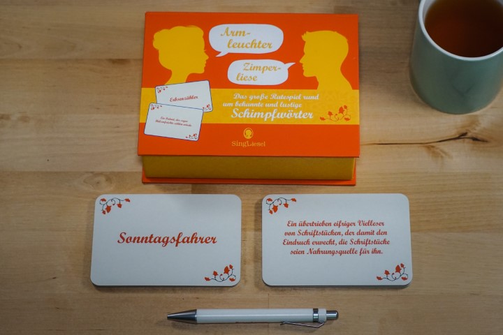 Auf der Vorderseite der Quiz-Karten steht ein Schimpfwort, auf der Rückseite eine kurze Beschreibung dazu. So kann mit diesem Quiz-Spiel für Senioren in beide Richtungen gerätselt werden. Entweder sucht man eine Erklärung für einen „Vollpfosten“. Oder man versucht, zu erraten, wie man eine Person nennt, die kaum intelligenter als ein Holzpfahl ist. - Wie viele Karten mit verschiedenen Schimpfwörtern sind enthalten?