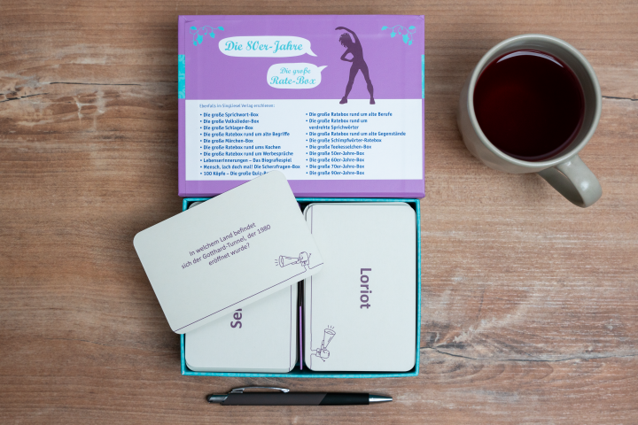Die Box enthält 100 Kartenspiele zum thematischen Gedächtnistraining und langlebigen Spielspaß.